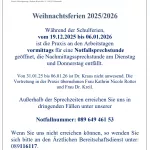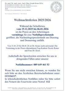 Während der Schulferien, vom 19.12.2025 bis 06.01.2026 ist die Praxis an den Arbeitstagen vormittags für eine Notfallsprechstunde geöffnet, die Nachmittagssprechstunde am Dienstag und Donnerstag entfällt. A, 24. und 31.12. ist die Praxis geschlossen.