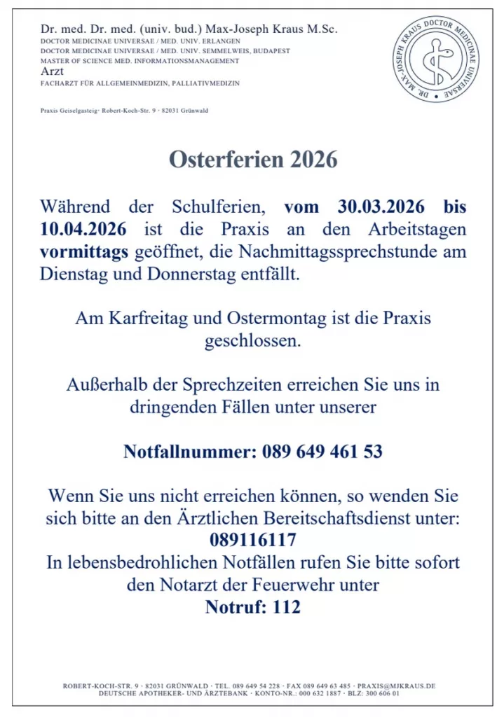 Während der Schulferien, vom 30.03.2026 bis 10.04.2026 ist die Praxis an den Arbeitstagen vormittags geöffnet, die Nachmittagssprechstunde am Dienstag und Donnerstag entfällt.